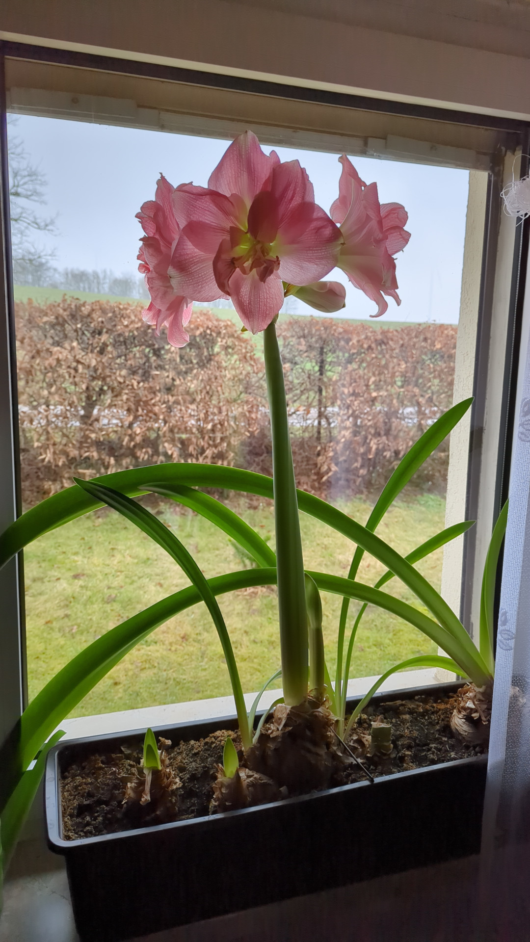rosa gefüllt Veröffentlicht 18. Januar 2026 am 1080 × 1920 in Amaryllis im Kasten diese Zwiebel ist schon 8 Jahre alt Rosa gefüllte Blüte an 8 Jahre alter Zwiebel, jedes Jahr 2 Blütenschäfte!